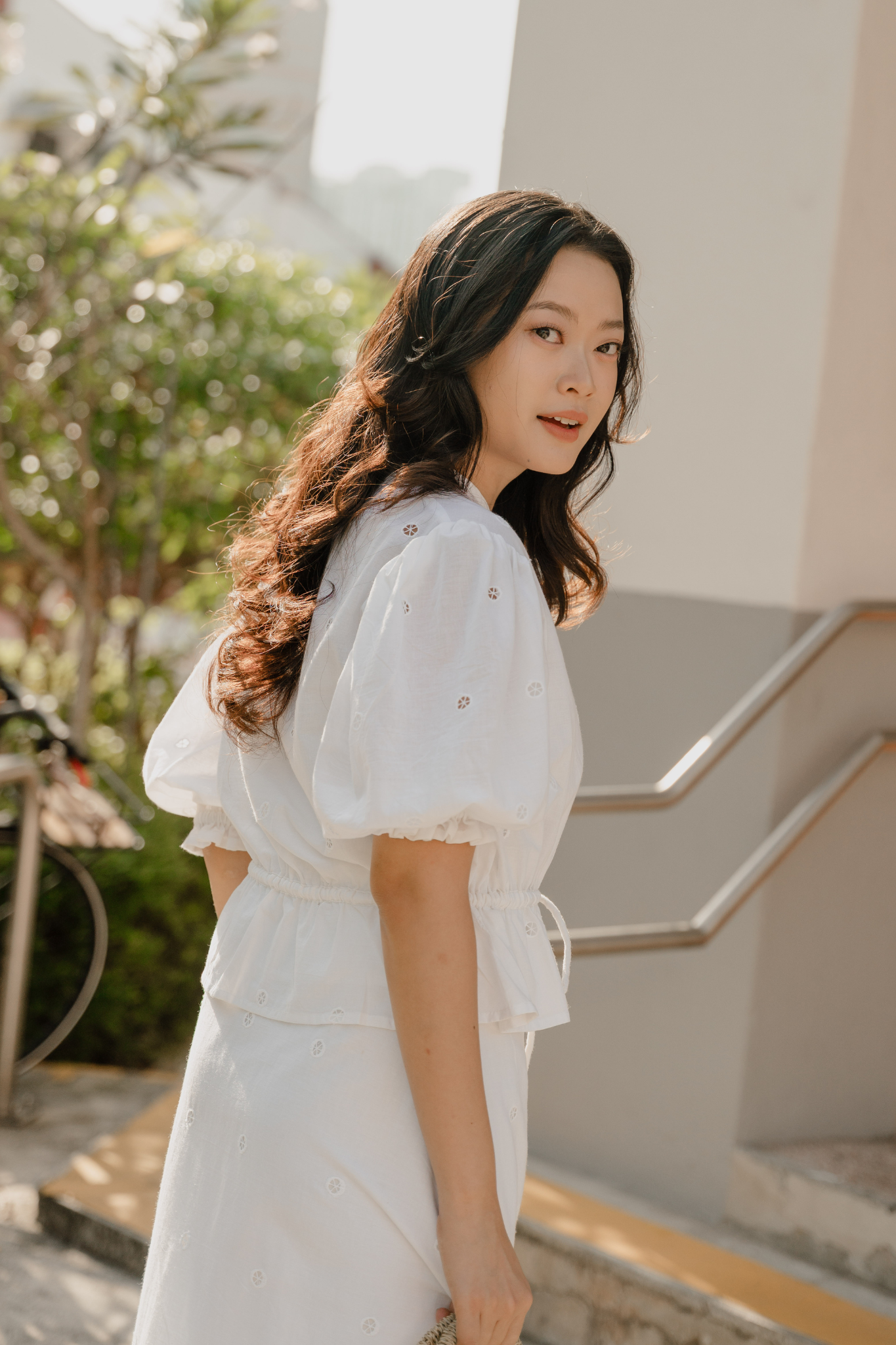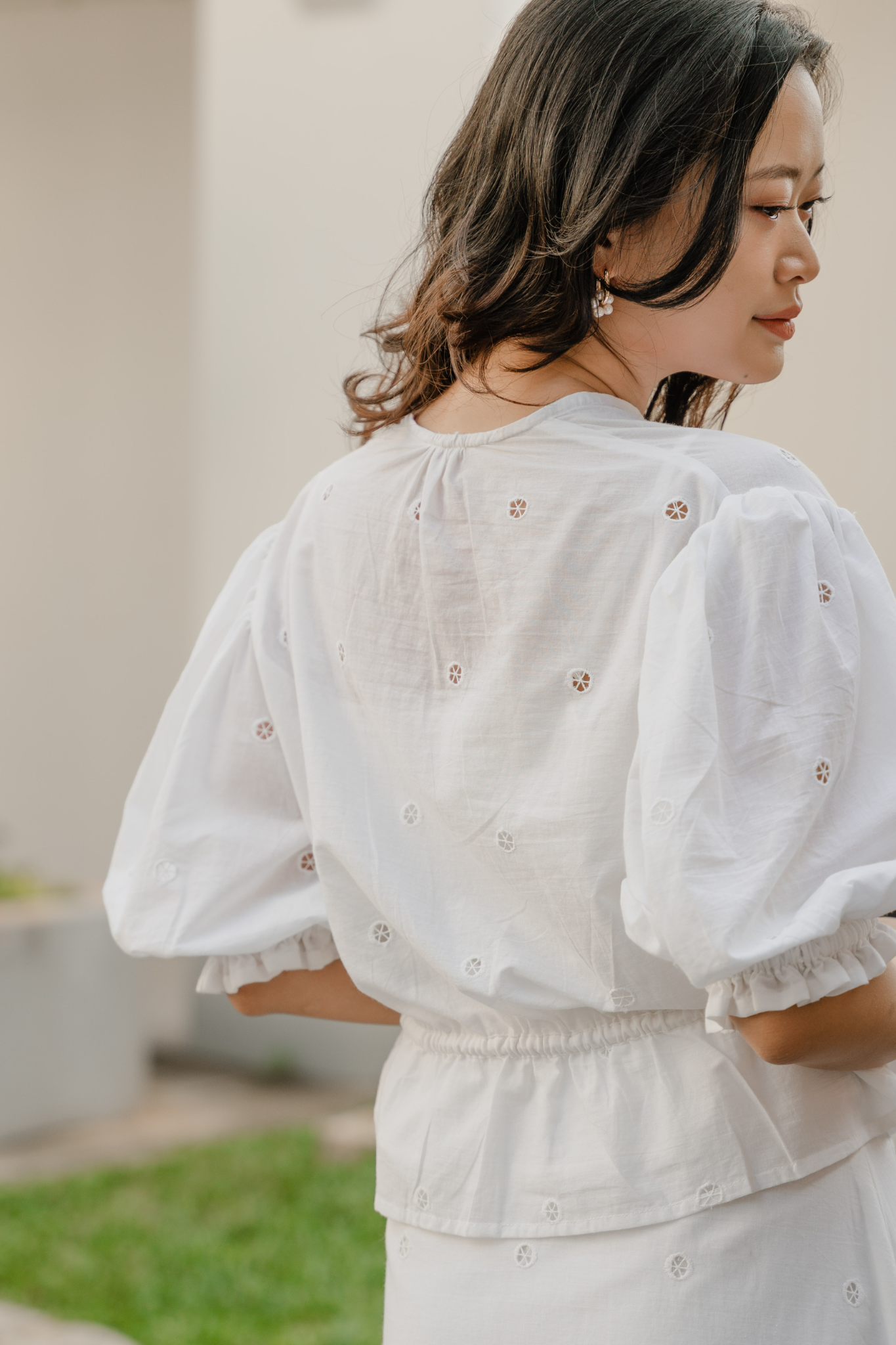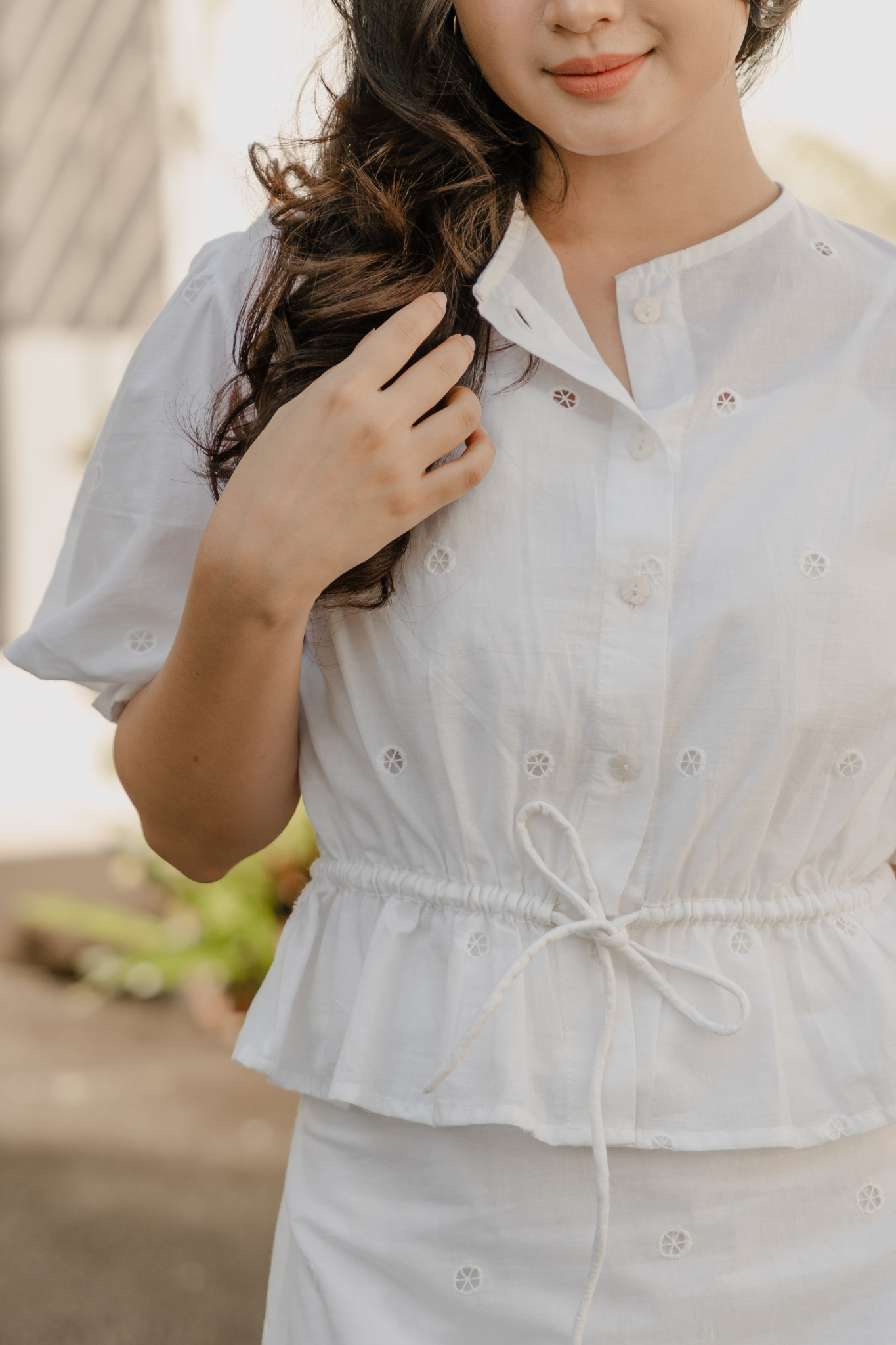 The Suria Blouse brings a soft, sunlit charm for your tropical holidays and everyday dressing. Crafted from lightweight cotton with intricate eyelet details, the Suria Blouse keeps you comfortable from slow mornings to warm afternoons. Puffed elasticated sleeves adds a graceful volume and a waist tie flatters your feminine curves. The blouse is finished with delicate floral shell buttons, a subtle detail that elevates the whole look. Pair it with the Suria Skirt for those unhurried weekends.